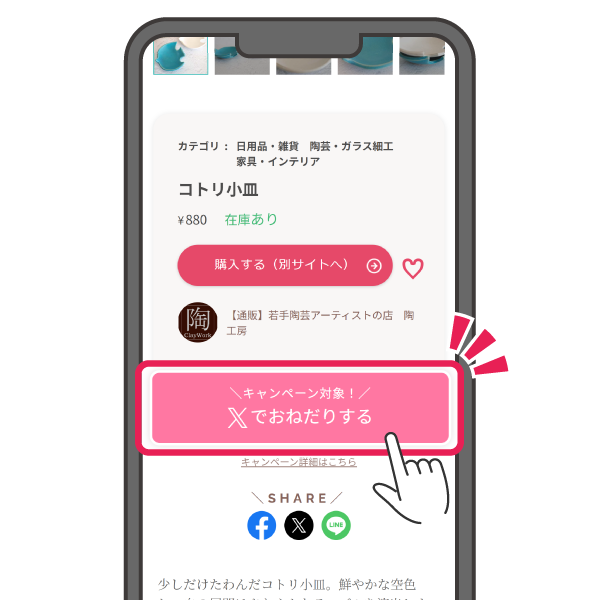 - 欲しい商品の商品詳細ページ内の「Xでおねだりする」ボタンからポストを作成
