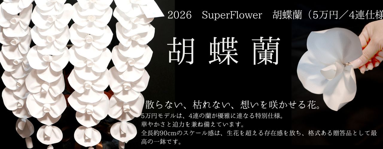 7万円モデルは、5連の蘭が優雅に咲き誇る特別仕様で、圧倒的な存在感と気品を備えています。 全長約95cmの堂々とした姿は、生花を凌ぐ迫力を放ち、最上級の贈答品として特別な場面を彩ります。 サイズ:全長 約95cm