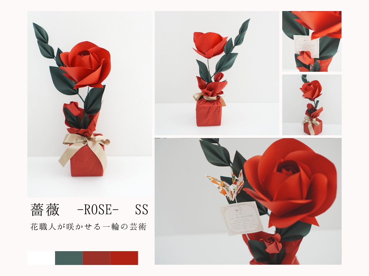 サイズ:W20cm × H38cm × D13cm ※1つ1つ手作りのため若干のサイズの変動あります。ご了承下さい。 SuperFlowerの中でも最も高い技術を要する「薔薇」を、 花職人が一輪ずつ丁寧に咲かせた人気のSSサイズ。 根本には小さな蕾を添え、開花へと向かう命の美しさを表現しています。 花器も紙で仕立て、和紙の包みと上品なリボンまでがアートの一部。 艶やかな赤の花びらが凛とした存在感を放ち、 ギフトとしてもインテリアとしても永く楽しめる一輪です。
