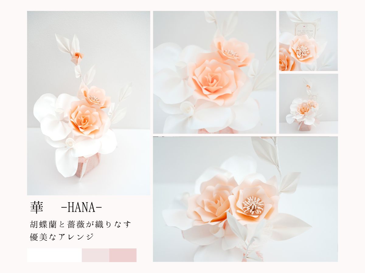 花器も紙製で、桃色の和紙レースが全体をふんわりとまとめ、