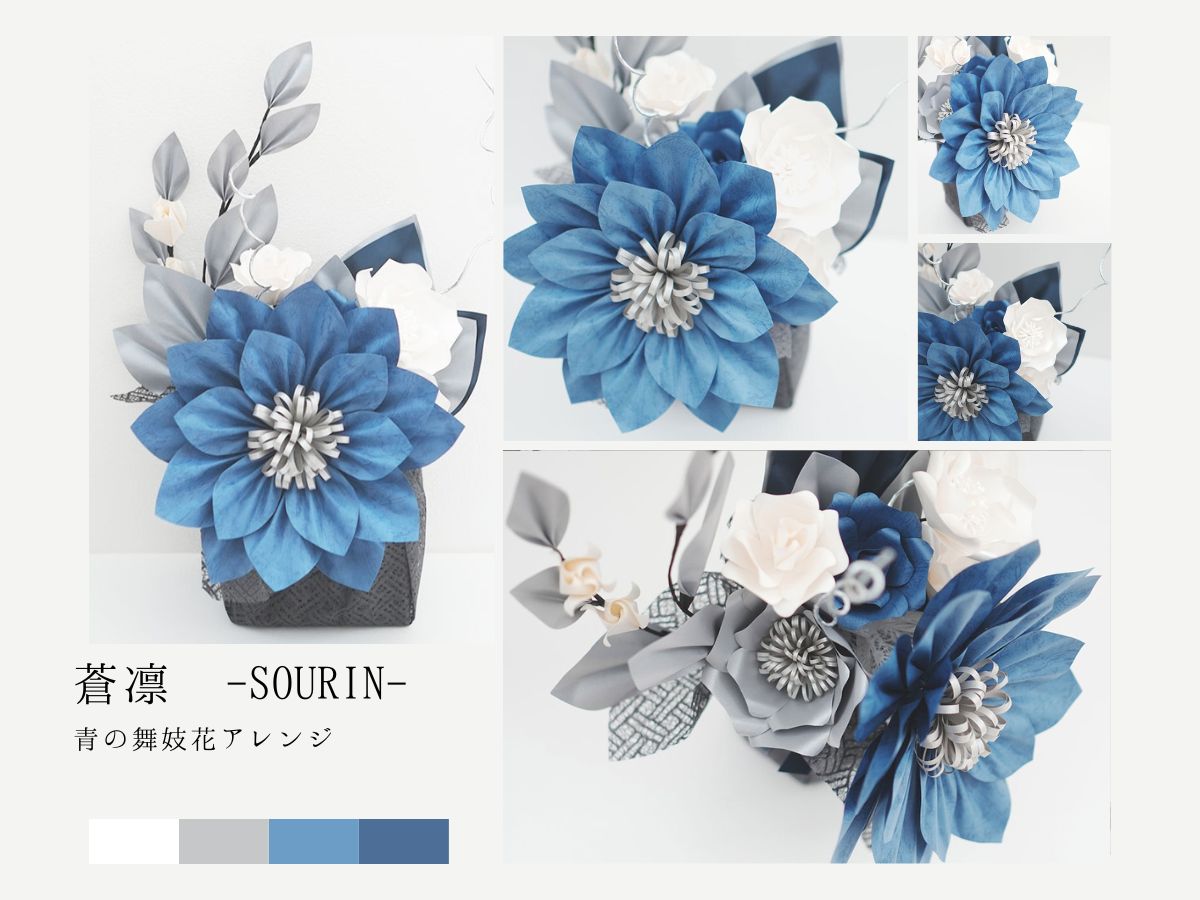サイズ:W32cm × H45cm × D22cm ※1つ1つ手作りのため若干のサイズの変動あります。ご了承下さい。 深く澄んだ青の舞妓花が凛と咲く、存在感のあるアレンジ。 白と銀の花々が寄り添い、静けさと品格を纏います。 空間を上質に引き締める、SuperFlowerのアート作品。