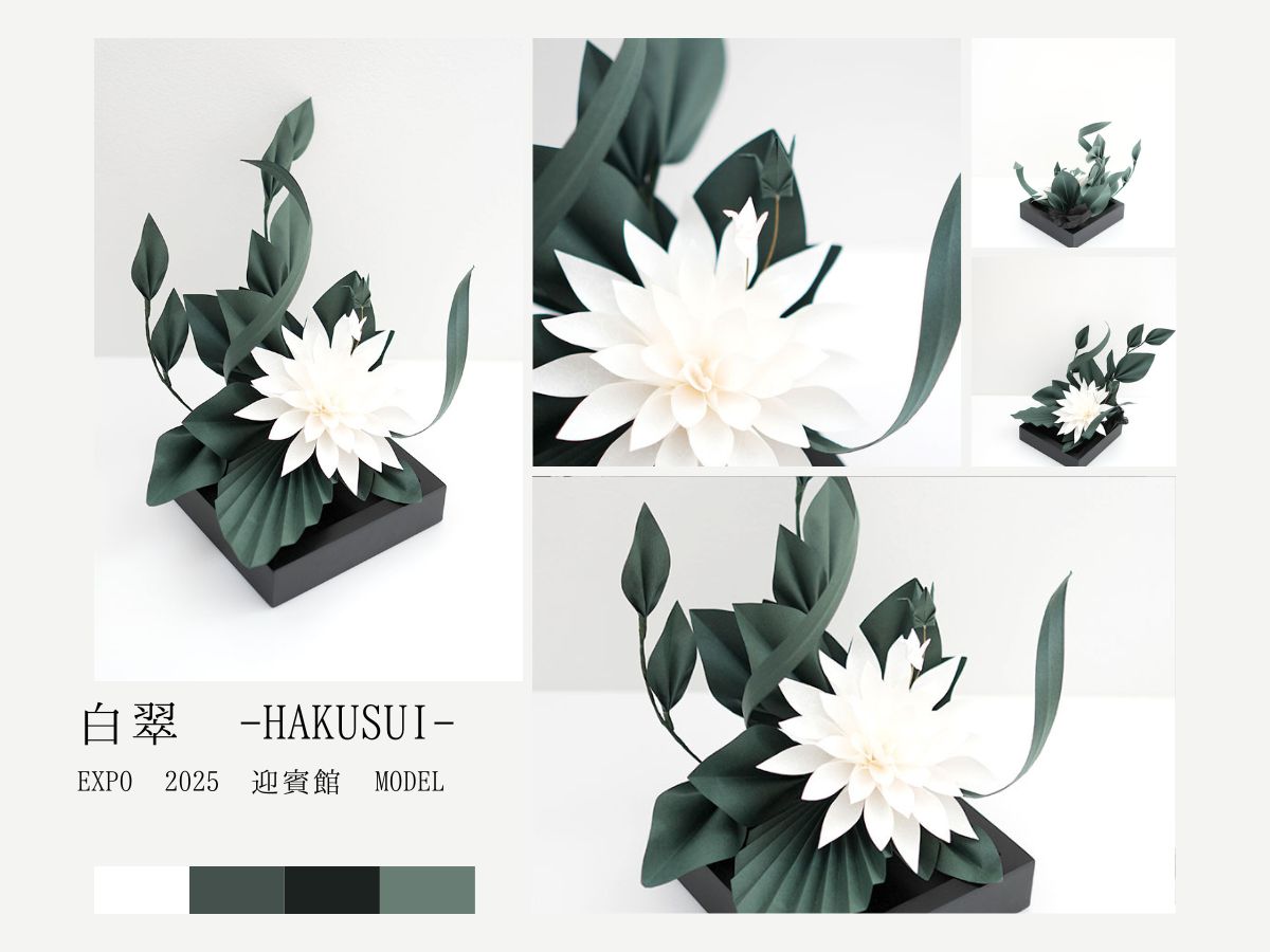 大阪・関西万博の迎賓館で飾られた構成をもとにデザインした、 和モダンのアレンジメント「白翠 -HAKUSUI-」。 深いグリーンの葉組みに、気品ある白花がすっと浮かび上がり、 静けさと存在感を同時に湛えます。 紙ならではの質感と立体構成が、光を柔らかく受け止め、 上質なインテリアや迎賓のシーンにも美しく寄り添います。