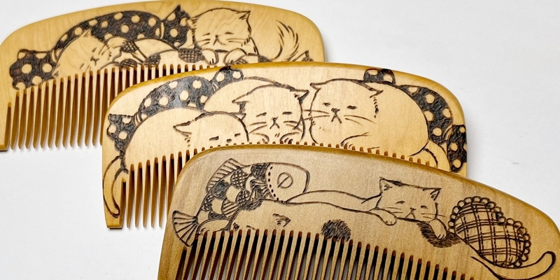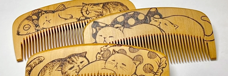 3人の作家様に櫛へ思い思いのネコを焦して描いて頂きました!