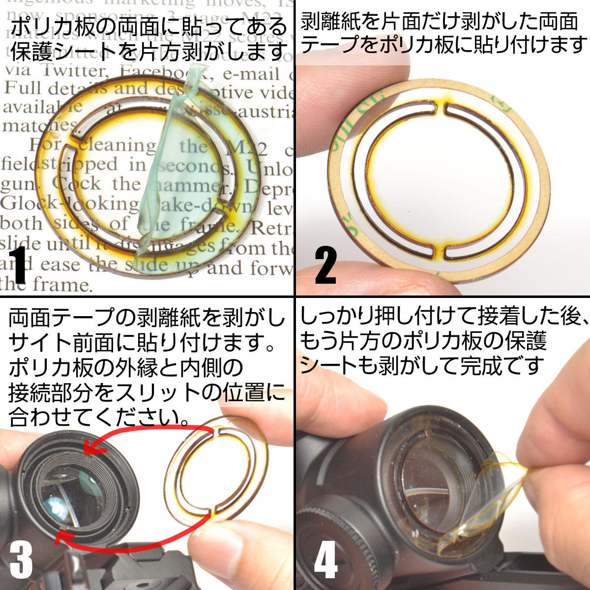 保護シートを剥がしたポリカ板に、片方の剥離紙を剥がした両面テープをしっかりと貼り付けてから、もう片方の剥離紙も剥がして対物レンズ前方のくぼみに押し込んでとりつけます。ポリカ板の外縁と内側の接続部分をスリットの位置に合わせてください。
