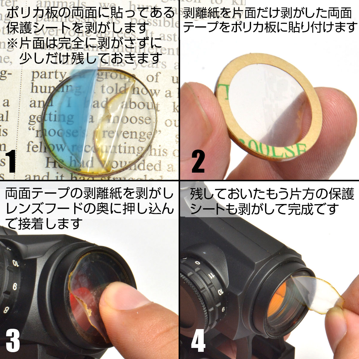 まず両面に貼ってある保護シートを剥がします。ここで、片面だけは少し残しておくのがコツです。保護シールを剥がした面に両面テープを貼り付け、レンズフード内に押し込んで接着します。最後に残しておいた保護シートを完全に剥がして完成です。