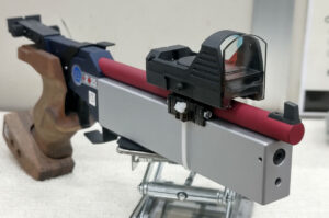 体験会などで射撃が初めての方にビームピストルを撃ってもらうと、どう頑張ってもサイトが合わずターゲットにも当たらない人がときどきいます。そういう方にも、「とりあえず撃って、ターゲットに当たる」という楽しさを味わってもらうためにビームピストルにドットサイトなどの光学照準器を取り付けたいという要望が以前からありました。そういう声に応えて開発したマウントです。