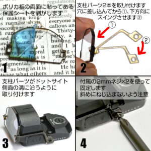 まずプロテクター本体に支柱パーツ2本を差し込んでから、ドットサイトに被せるようにして位置を決めて、付属の2mmネジを使って本体に固定します。支柱パーツと本体のネジ穴の位置をしっかり合わせて、ネジをネジ穴に対して垂直になるよう注意してネジを締めてください(斜めにならないよう注意!)。