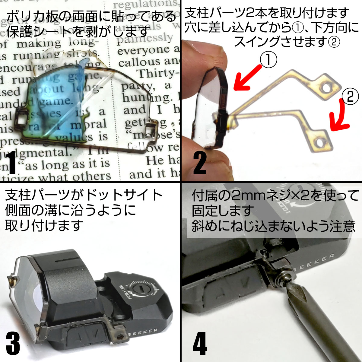 通常の方法ではレンズ前方にポリカ板を固定することができない形状をしているドットサイトですが、ドットサイトの側面になぜか空いている用途不明の2mmネジ穴を利用してポリカ板を固定し、そのポリカ板で前方のレンズ保護用ポリカ板を支えるやり方でレンズ保護を可能にしました。外観の変化もわずかで、マウント部分への影響も極小なためハンドガンのスライド上などへのマウントも可能です。※ドットサイトは別売りです。