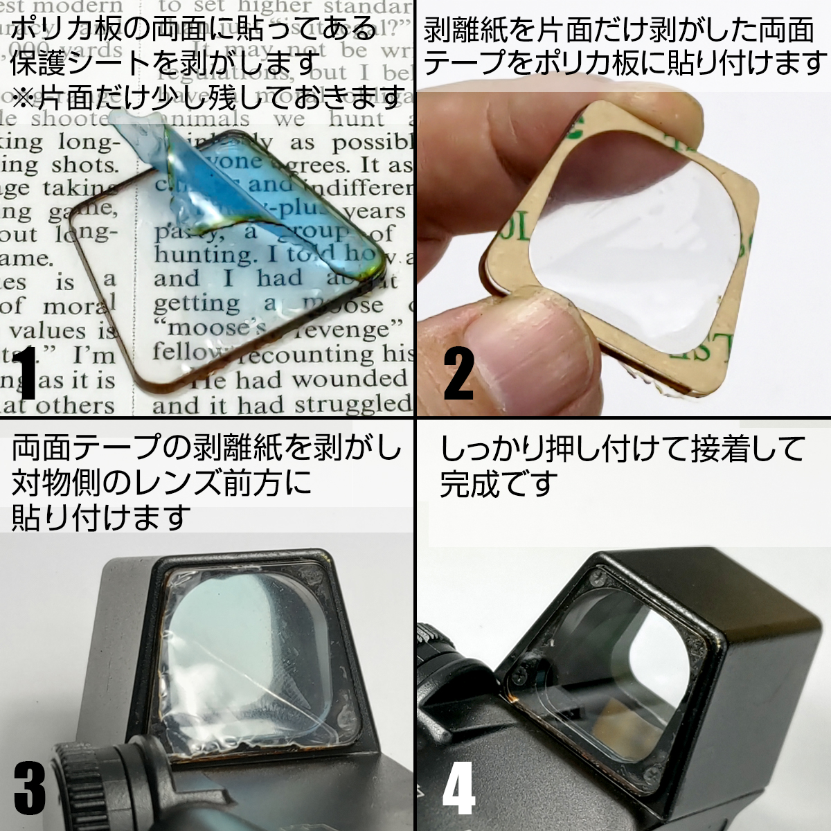 -------------ポリカ板両面に貼ってある保護シートを剥がし(片方だけ少し残しておくのがコツです)、完全に剥がした面に両面テープを貼り付けてドットサイト本体に押し付けて接着します。最後に残しておいた保護シートを剥がして取り付け完了です。