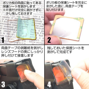 保護シートを剥がしたポリカ板に、片方の剥離紙を剥がした両面テープをしっかりと貼り付けてから、もう片方の剥離紙も剥がして対物レンズ前方に押し込んでとりつけます。