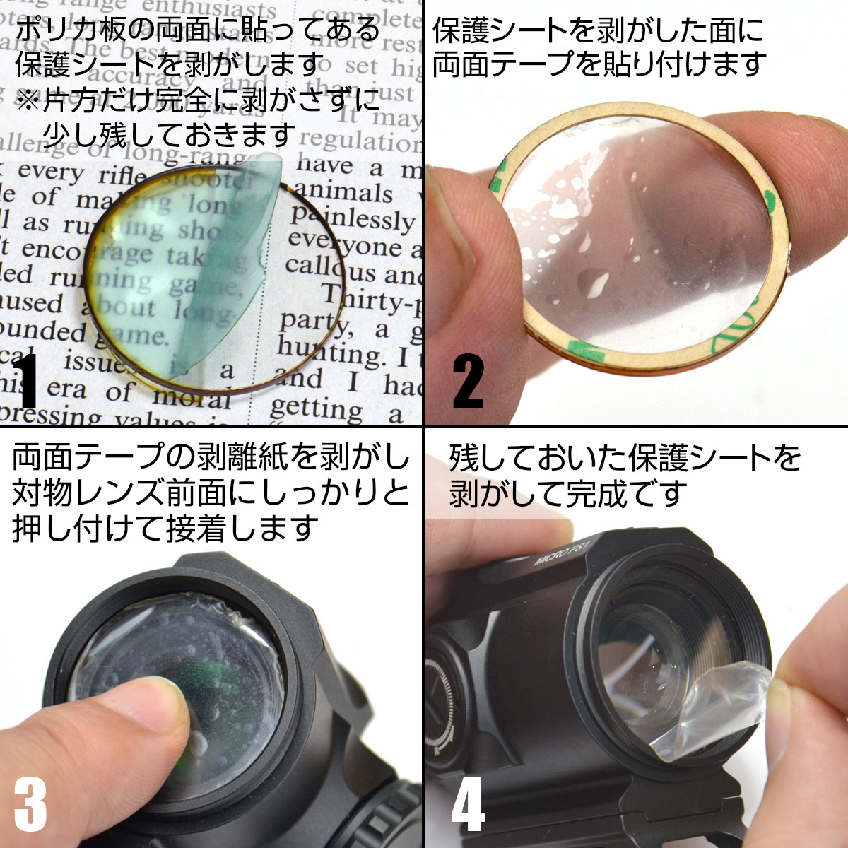 ノーベルアームズの等倍プリズムサイト、SURE HIT MPS-1専用のプロテクターです。対物レンズ前、レンズフードより少し奥まった場所に、厚さ1.5mmのポリカ板を両面テープを使って貼り付けます。