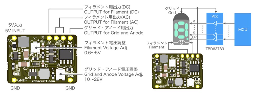 2024.1.6 改良しましたフィラメント電圧を最大4.2Vから5Vへ拡大しましたこれにより6本のVFDのフィラメントを直列接続してもご利用いただけるようになりました基板や以降の説明には最大±4.2Vと書いてありますが、実際は最大±5Vとなっております