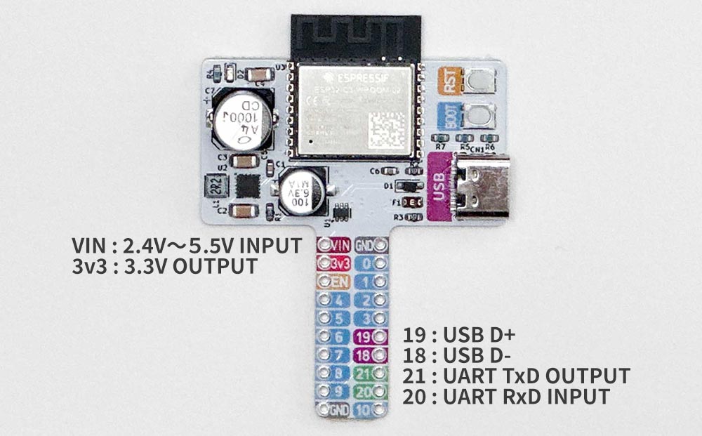 🟡特徴・動作電圧範囲が広いので、乾電池や充電電池&太陽電池といった不安定な電源で動作させるのに最適です・ピンヘッダはDIP ICの幅になっているので、ブレッドボードを有効に利用することができます・ESP32-C3の全てのピンがピンヘッダに接続されています・UVプリント基板を使用し特殊なピンが一目でわかります・WiFiを使用しなければ電源電圧1.8Vまで動作します