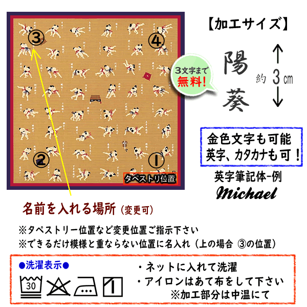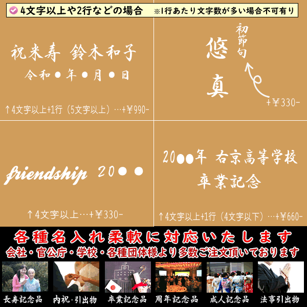 【加工方法につきまして】※刺繍・印刷ではございません●名入れ・家紋(6cm以上)・ロゴなど京都の金彩加工職人(伝統工芸士)が「型を作製」→「樹脂をヘラにて摺り込み」をして加工します。●苗字や名前・社名・記念名など3文字までが無料!※スペース(空白)は1文字●カタカナ、アルファベットでの名入れも可能です※他言語はデータがあれば可能です●【直筆文字】や【思い出の文字】など対応可能です ※別途お見積り●金色での加工も可能です。※オプション※文字数や文字の大きさよって金額は変わりますのでお問い合わせ下さいませ。※ご注文数により割引がございますのでお気軽に見積りのご依頼をして下さいませ。※記念名など追加料金が掛かる場合はご連絡後、承諾を頂き金額修正させて頂きます。※文字数が多い場合、小さくなりすぎて加工ができない場合がございます。(1行あたり約10文字程度まで)◉加工代 (スペース 空白は1文字)・1行目:3文字まで無料・1行目:4文字以上は+¥330・2行目以降:4文字まで+¥330-、5文字以上+¥660-※加工代は各行数価格の合計です(例:1行目4文字+2行目5文字 ¥330+¥660=¥990-)◉校章・ロゴやマークなどについて最下部の「よくある質問」をお読みくださいませ。