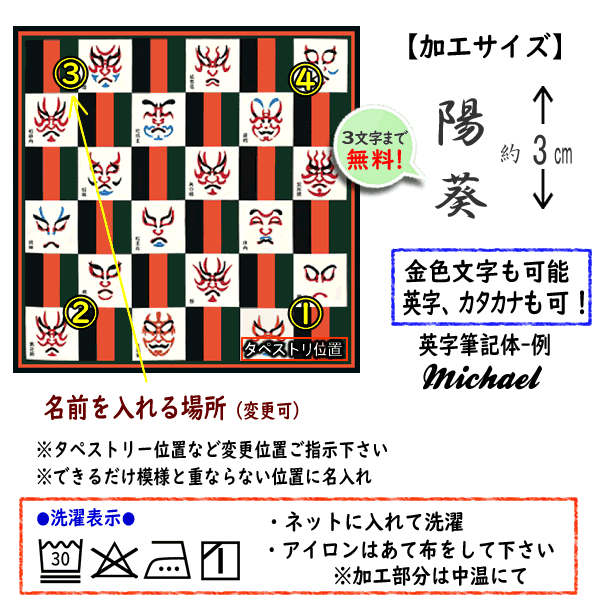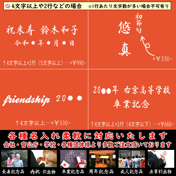 【加工方法につきまして】※刺繍・印刷ではございません●名入れ・家紋(6cm以上)・ロゴなど京都の金彩加工職人(伝統工芸士)が「型を作製」→「樹脂をヘラにて摺り込み」をして加工します。●苗字や名前・社名・記念名など3文字までが無料!※スペース(空白)は1文字●カタカナ、アルファベットでの名入れも可能です※他言語はデータがあれば可能です●【直筆文字】や【思い出の文字】など対応可能です ※別途お見積り●金色での加工も可能です。※オプション※文字数や文字の大きさよって金額は変わりますのでお問い合わせ下さいませ。※ご注文数により割引がございますのでお気軽に見積りのご依頼をして下さいませ。※記念名など追加料金が掛かる場合はご連絡後、承諾を頂き金額修正させて頂きます。※文字数が多い場合、小さくなりすぎて加工ができない場合がございます。(1行あたり約10文字程度まで)◉加工代 (スペース 空白は1文字)・1行目:3文字まで無料・1行目:4文字以上は+¥330・2行目以降:4文字まで+¥330-、5文字以上+¥660-※加工代は各行数価格の合計です(例:1行目4文字+2行目5文字 ¥330+¥660=¥990-)◉校章・ロゴやマークなどについて最下部の「よくある質問」をお読みくださいませ。