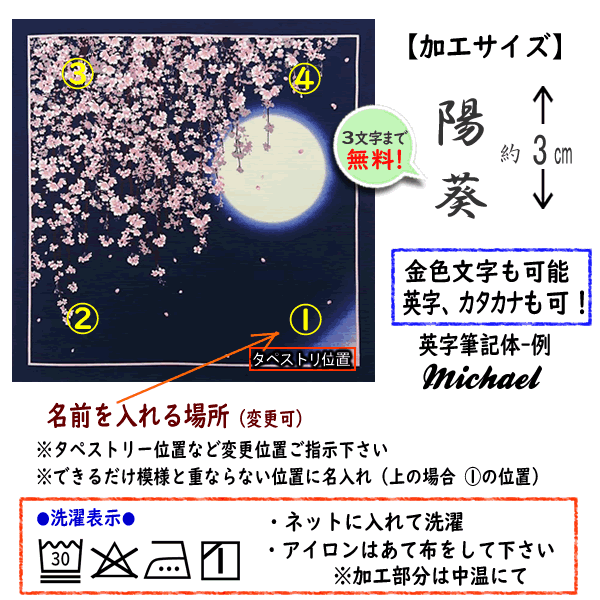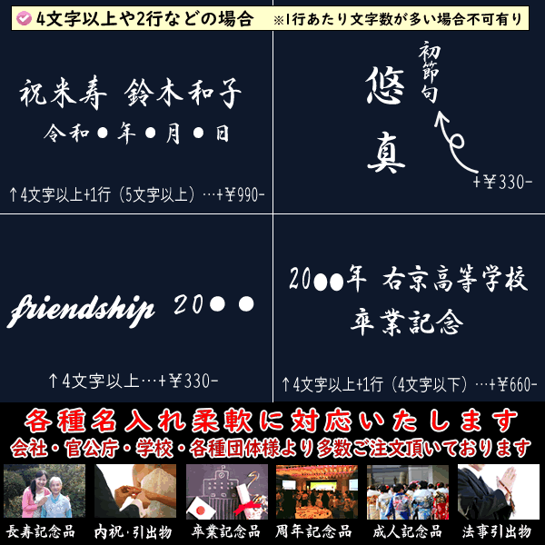 【加工方法につきまして】※刺繍・印刷ではございません●名入れ・家紋(6cm以上)・ロゴなど京都の金彩加工職人(伝統工芸士)が「型を作製」→「樹脂をヘラにて摺り込み」をして加工します。●苗字や名前・社名・記念名など3文字までが無料!※スペース(空白)は1文字●カタカナ、アルファベットでの名入れも可能です※他言語はデータがあれば可能です●【直筆文字】や【思い出の文字】など対応可能です ※別途お見積り●金色での加工も可能です。※オプション※文字数や文字の大きさよって金額は変わりますのでお問い合わせ下さいませ。※ご注文数により割引がございますのでお気軽に見積りのご依頼をして下さいませ。※記念名など追加料金が掛かる場合はご連絡後、承諾を頂き金額修正させて頂きます。※文字数が多い場合、小さくなりすぎて加工ができない場合がございます。(1行あたり約10文字程度まで)◉加工代 (スペース 空白は1文字)・1行目:3文字まで無料・1行目:4文字以上は+¥330・2行目以降:4文字まで+¥330-、5文字以上+¥660-※加工代は各行数価格の合計です(例:1行目4文字+2行目5文字 ¥330+¥660=¥990-)◉校章・ロゴやマークなどについて最下部の「よくある質問」をお読みくださいませ。