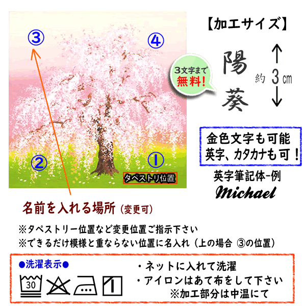 【加工方法につきまして】※刺繍・印刷ではございません●名入れ・家紋(6cm以上)・ロゴなど京都の金彩加工職人(伝統工芸士)が「型を作製」→「樹脂をヘラにて摺り込み」をして加工します。●苗字や名前・社名・記念名など3文字までが無料!※スペース(空白)は1文字●カタカナ、アルファベットでの名入れも可能です※他言語はデータがあれば可能です●【直筆文字】や【思い出の文字】など対応可能です ※別途お見積り●金色での加工も可能です。※オプション※文字数や文字の大きさよって金額は変わりますのでお問い合わせ下さいませ。※ご注文数により割引がございますのでお気軽に見積りのご依頼をして下さいませ。※記念名など追加料金が掛かる場合はご連絡後、承諾を頂き金額修正させて頂きます。※文字数が多い場合、小さくなりすぎて加工ができない場合がございます。(1行あたり約10文字程度まで)◉加工代 (スペース 空白は1文字)・1行目:3文字まで無料・1行目:4文字以上は+¥330・2行目以降:4文字まで+¥330-、5文字以上+¥660-※加工代は各行数価格の合計です(例:1行目4文字+2行目5文字 ¥330+¥660=¥990-)◉校章・ロゴやマークなどについて最下部の「よくある質問」をお読みくださいませ。