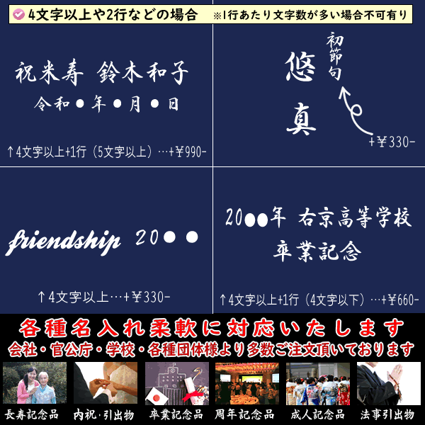 【加工方法につきまして】※刺繍・印刷ではございません●名入れ・家紋(6cm以上)・ロゴなど京都の金彩加工職人(伝統工芸士)が「型を作製」→「樹脂をヘラにて摺り込み」をして加工します。●苗字や名前・社名・記念名など3文字までが無料!※スペース(空白)は1文字●カタカナ、アルファベットでの名入れも可能です※他言語はデータがあれば可能です●【直筆文字】や【思い出の文字】など対応可能です ※別途お見積り●金色での加工も可能です。※オプション※文字数や文字の大きさよって金額は変わりますのでお問い合わせ下さいませ。※ご注文数により割引がございますのでお気軽に見積りのご依頼をして下さいませ。※記念名など追加料金が掛かる場合はご連絡後、承諾を頂き金額修正させて頂きます。※文字数が多い場合、小さくなりすぎて加工ができない場合がございます。(1行あたり約10文字程度まで)◉加工代 (スペース 空白は1文字)・1行目:3文字まで無料・1行目:4文字以上は+¥330・2行目以降:4文字まで+¥330-、5文字以上+¥660-※加工代は各行数価格の合計です(例:1行目4文字+2行目5文字 ¥330+¥660=¥990-)◉校章・ロゴやマークなどについて最下部の「よくある質問」をお読みくださいませ。