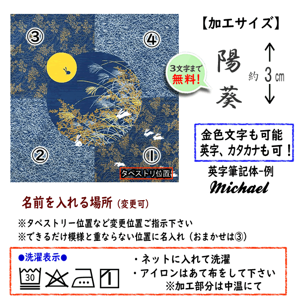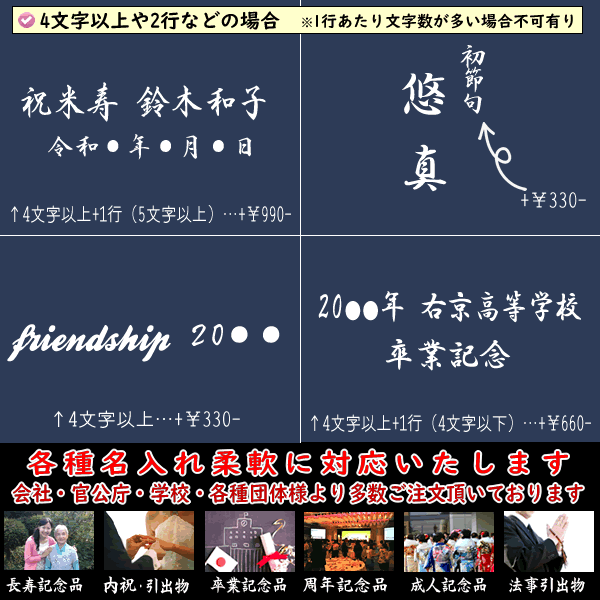 【加工方法につきまして】※刺繍・印刷ではございません●名入れ・家紋(6cm以上)・ロゴなど京都の金彩加工職人(伝統工芸士)が「型を作製」→「樹脂をヘラにて摺り込み」をして加工します。●苗字や名前・社名・記念名など3文字までが無料!※スペース(空白)は1文字●カタカナ、アルファベットでの名入れも可能です※他言語はデータがあれば可能です●【直筆文字】や【思い出の文字】など対応可能です ※別途お見積り●金色での加工も可能です。※オプション※文字数や文字の大きさよって金額は変わりますのでお問い合わせ下さいませ。※ご注文数により割引がございますのでお気軽に見積りのご依頼をして下さいませ。※記念名など追加料金が掛かる場合はご連絡後、承諾を頂き金額修正させて頂きます。※文字数が多い場合、小さくなりすぎて加工ができない場合がございます。(1行あたり約10文字程度まで)◉加工代 (スペース 空白は1文字)・1行目:3文字まで無料・1行目:4文字以上は+¥330・2行目以降:4文字まで+¥330-、5文字以上+¥660-※加工代は各行数価格の合計です(例:1行目4文字+2行目5文字 ¥330+¥660=¥990-)◉校章・ロゴやマークなどについて最下部の「よくある質問」をお読みくださいませ。