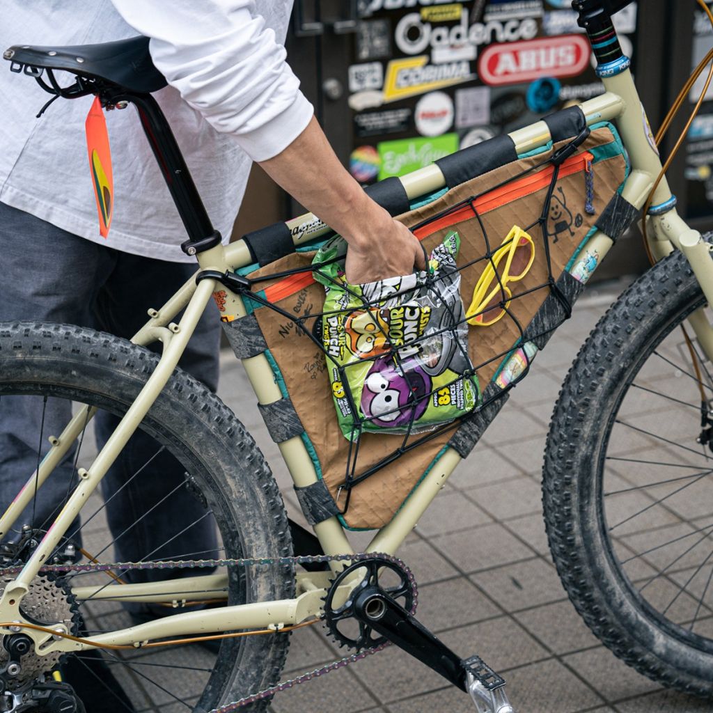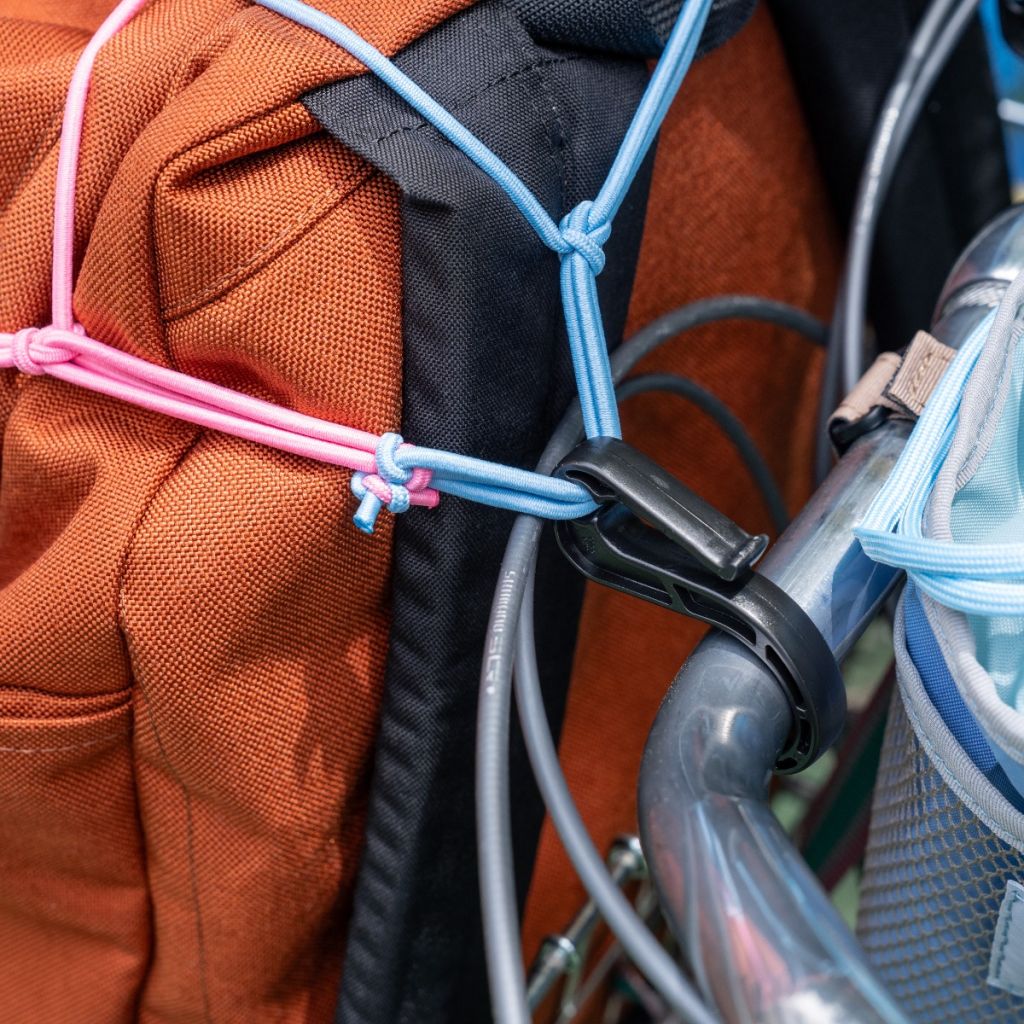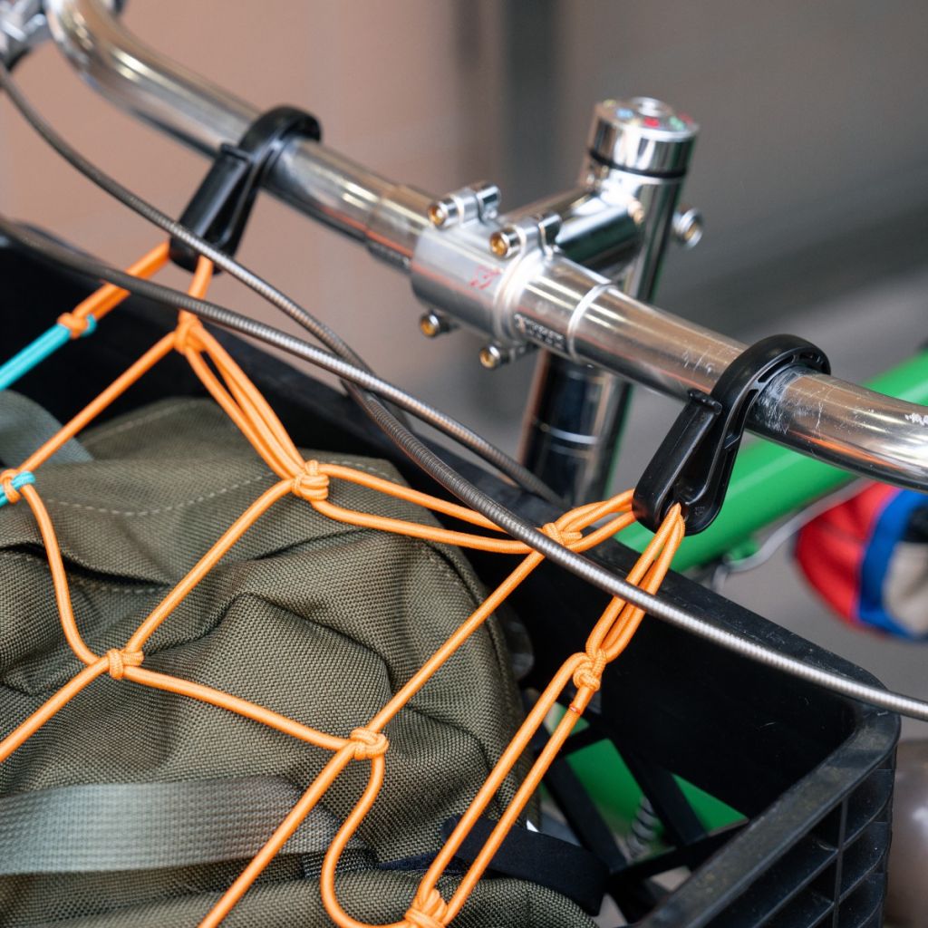 アルミ製のカラビナは大抵のラックに使われている〜12mm径パイプに対応。プラフックはハンドルバーにも引っ掛けられる大きめサイズ。スタイルに応じていろんな固定方法が試せます。