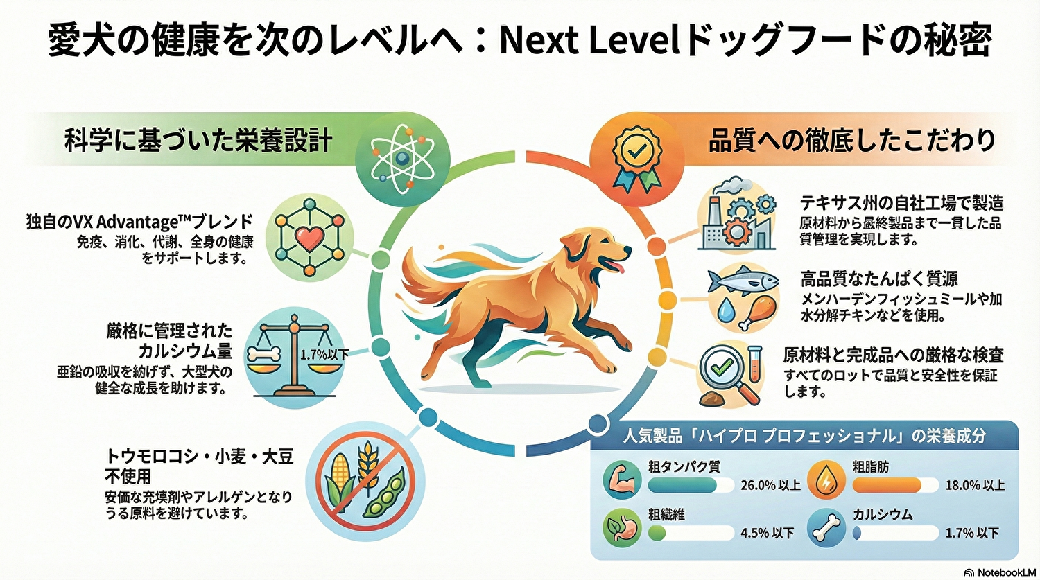 徹底したミネラル管理(特にカルシウム)ネクストレベルの最大の強みの一つは、カルシウム含有量を厳格に制限していることです。 1.7%以下の基準: FDAは2.5%までのカルシウムを認めていますが、ネクストレベルは全製品を1.7%以下に抑えています。その理由: 過剰なカルシウムは、皮膚や被毛の健康に不可欠な亜鉛の吸収を阻害し、特に大型犬の骨格形成に悪影響を及ぼすためです。