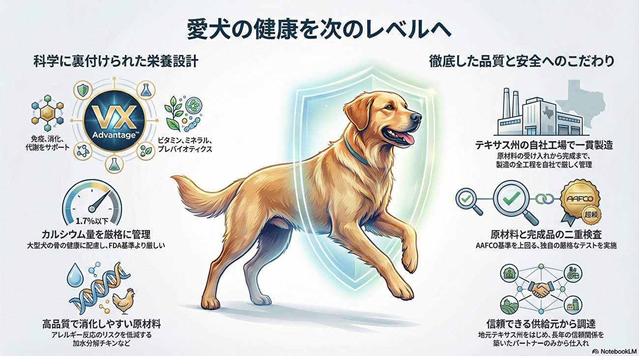 ● 元Victorの創設者によって設立されたこのブランドは、独自の「VX Advantage」ブレンドを採用し、消化器の健康、免疫力、代謝をサポートする栄養設計を特徴としています。特に、成長障害や亜鉛吸収の阻害を防ぐためにカルシウム含有量を制限している点が、大型犬や競技犬の飼い主から高く評価されています。また、加水分解チキンやメンハーデンフィッシュといった高品質な原材料を使用し、アレルギー対策や皮膚・被毛の改善に効果があることが示されています。プロのブリーダーやハンター、一般の愛好家の視点を通じて、科学的根拠に基づいた高い信頼性を得ています。