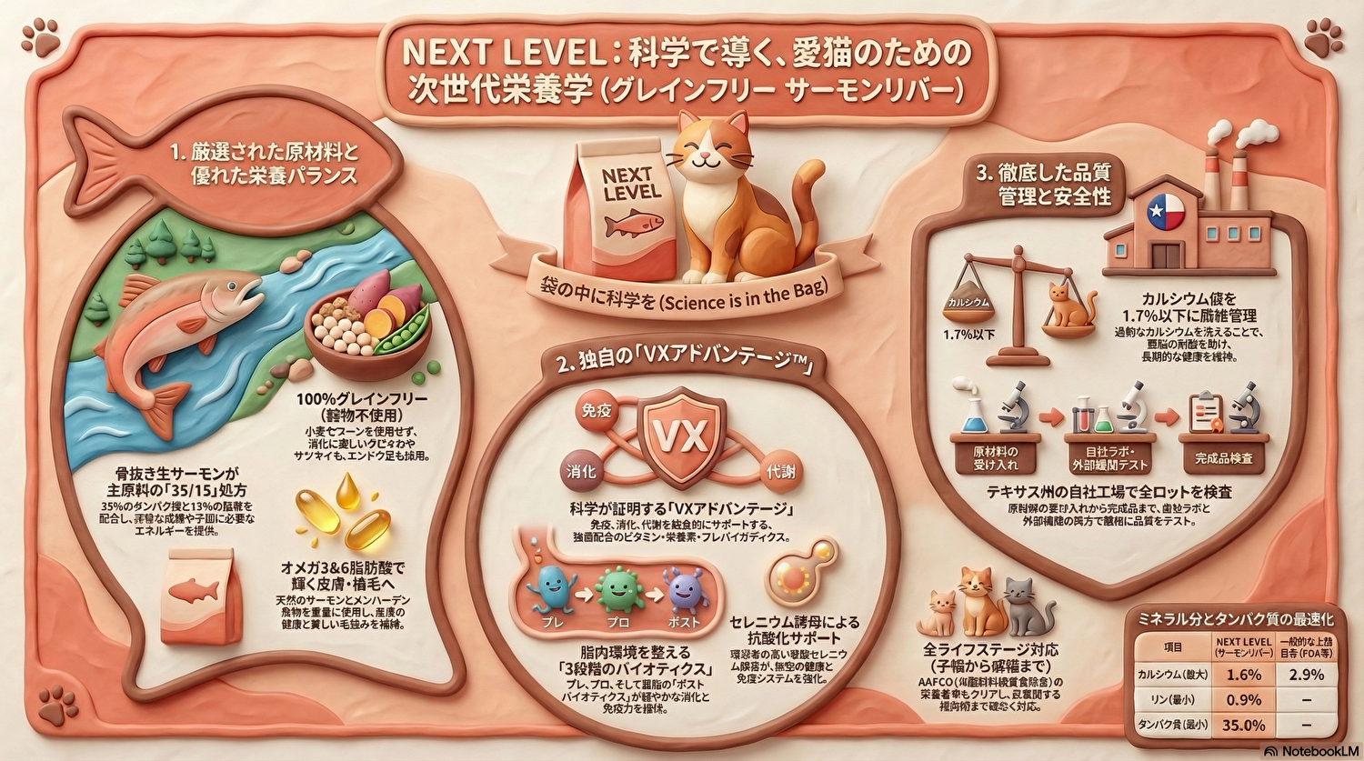 VX Advantage™FOR CATS🛡 猫のためのVXアドバンテージ™ for キャッツNext Levelのすべてのレシピは、厳選された高品質のタンパク質をベースに、独自のブレンドであるVXアドバンテージ™を配合しています。VXアドバンテージ™は、免疫力、消化機能、代謝、そして全身の健康を促進するために科学的に処方されたビタミン、栄養素、プレバイオティクスの組み合わせです。Next Level は、これらの科学的根拠に基づいた成分が実際に製品の中に含まれていることを強調するため、「Science is in the bag(科学は袋の中に)」という言葉を商標登録しています。