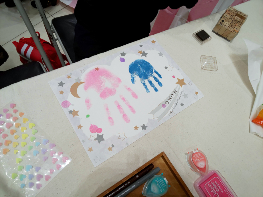 ローマ字スタンプがあると、名前部分がお洒落になります。また、手形にも可愛いスタンプがあってもいいですね。- シールやペン