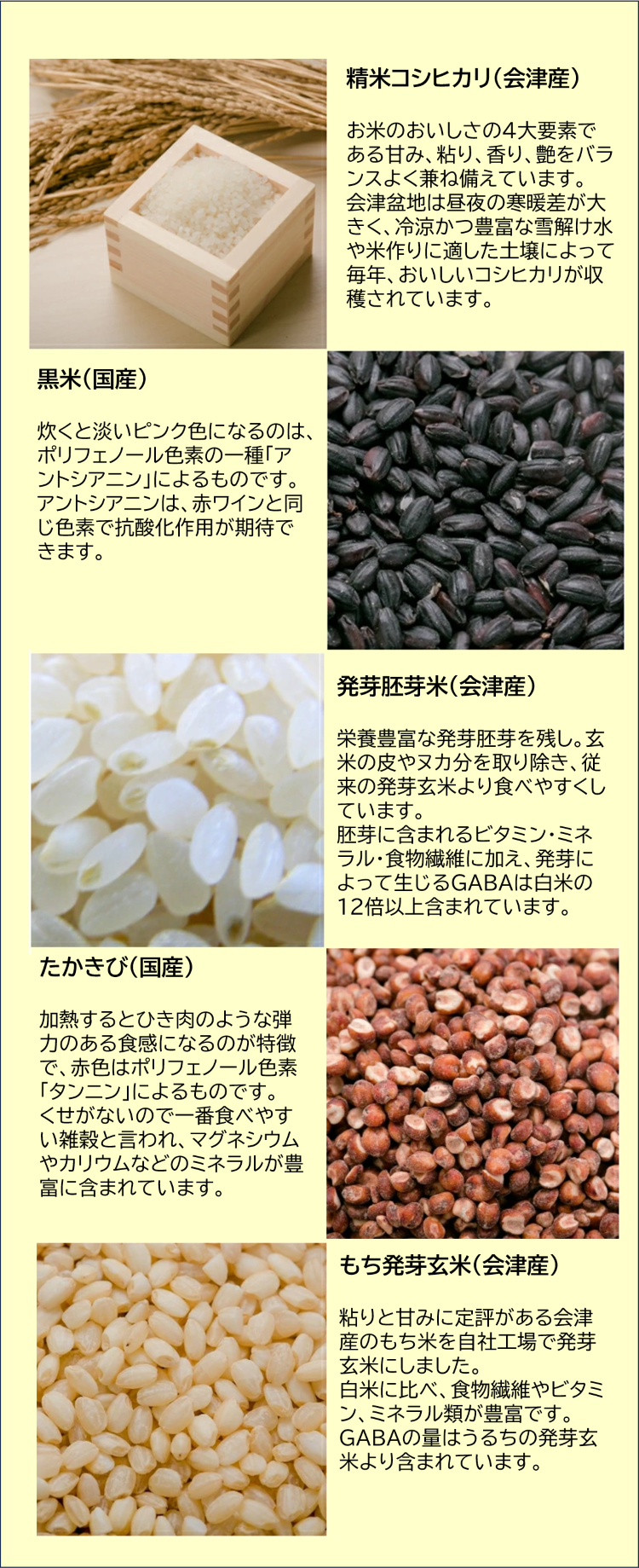 原材料名 精白米(会津産コシヒカリ)、発芽胚芽米(会津産コシヒカリ)、発芽もち玄米(会津産こがねもち)、たかきび(国産)、黒米(国産) 保存方法