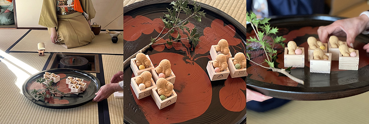 ころんと小さな枡の表と裏には、福と鬼の絵が描かれています。豆を盛るのはもちろん、立春のころのおもてなしに干菓子を盛りつけても素敵です。