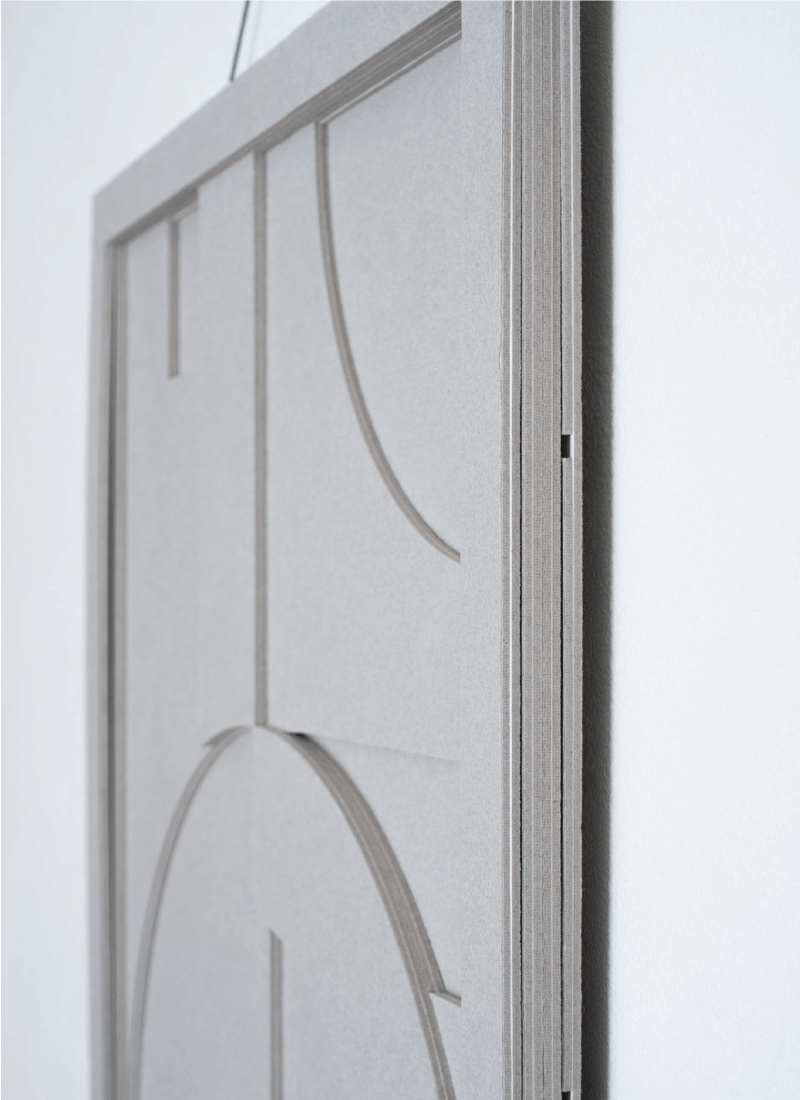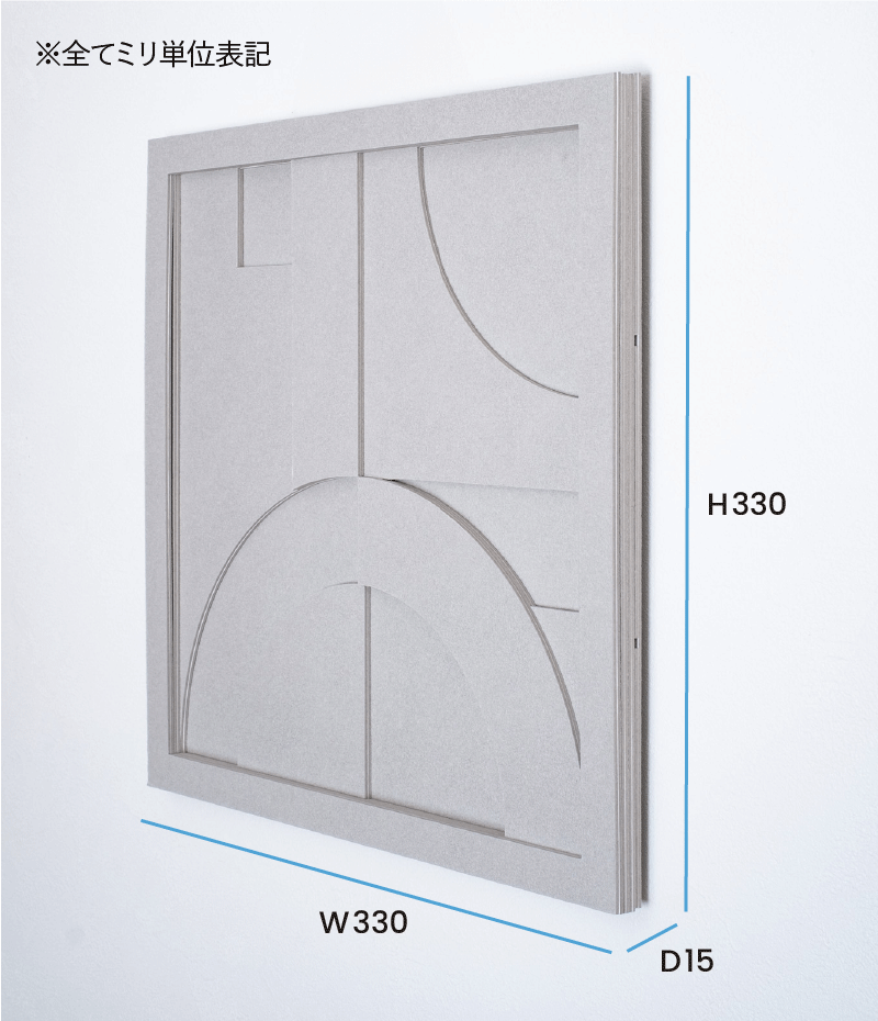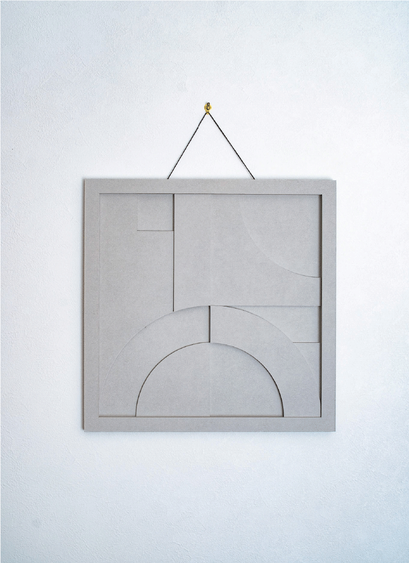 化粧貼りした厚紙を積層し、シルエットの重なりで立体感を作り、仕上げるアートボード。