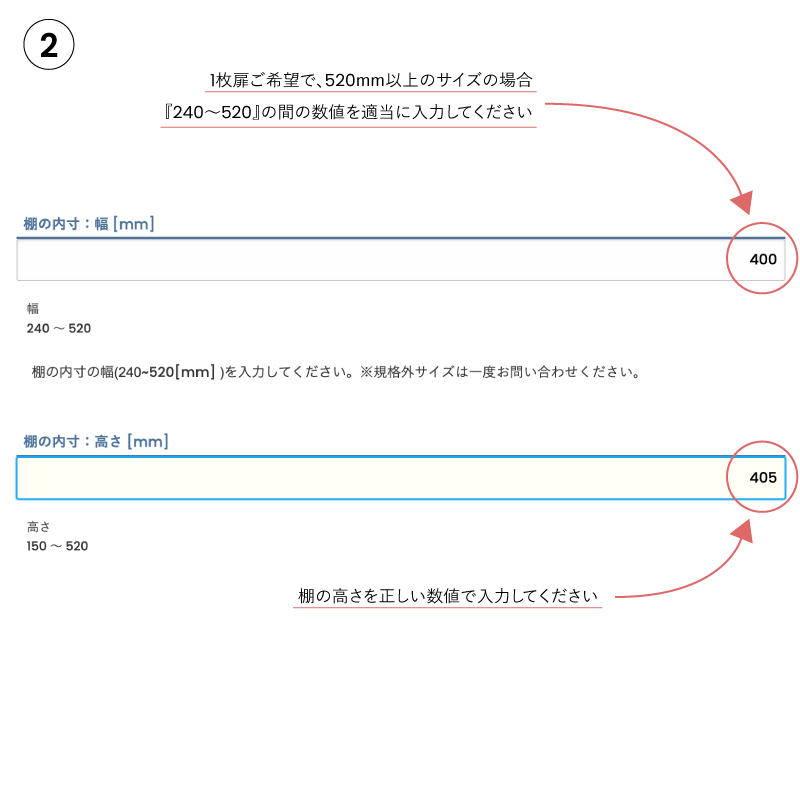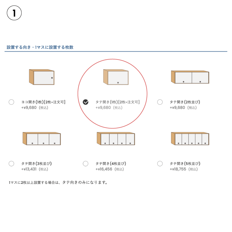 オーダー方法・「設置する向き」をお選びください。・「サイズ」で棚の収納スペースの内寸をご記入ください。※扉の仕上がり寸法は、製作側で判断いたしますのでご安心ください。![]()