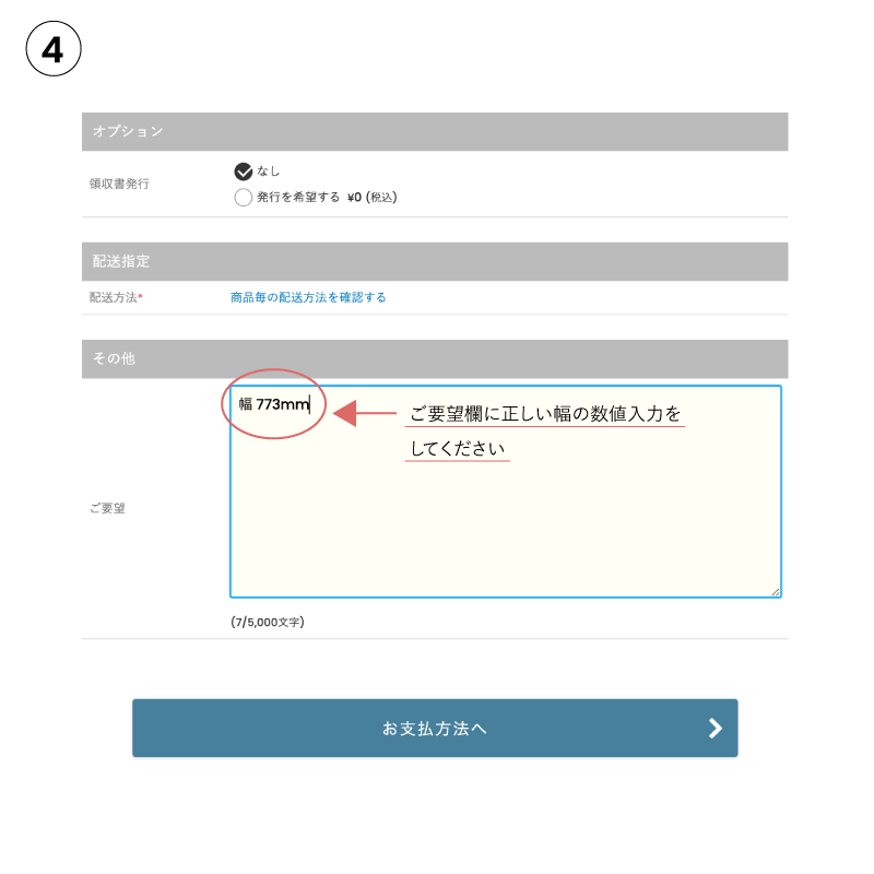 ② オーダーフォームに入力※規格外サイズの場合今回製作したサイズは『773×405』1枚扉