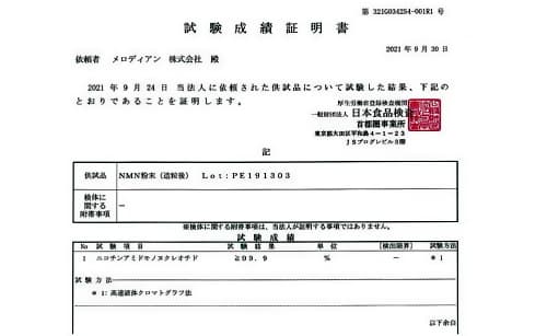 毎日体の中に取り入れるものなので99.9%と純度にこだわり製造された原料を使用。原材料に使用しているNMNはロット毎に国内で純度分析を行っています。 (日本食品分析センターにて分析)