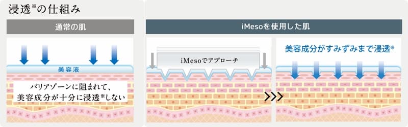 iMeso(アイメソ)は、先端テクノロジーによって開発された『メソチップ』を使用。髪の毛の1/1000の微細な穴は、肌に負担をかけることなく、美容液の浸透性※を高めます。※角質層まで