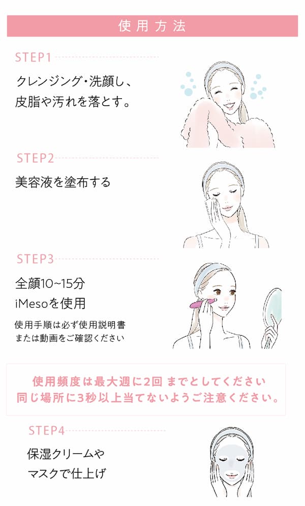 使用上のご注意iMeso使用後30分間はメイクをしないでください。敏感になりやすいスキンケア製品を使用する際は、本製品を併用しないでください。レフィルは使い捨てです。