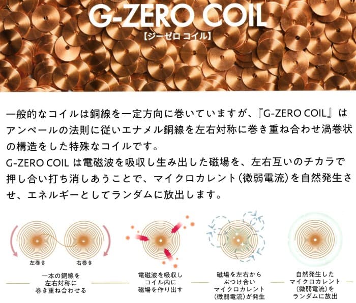 G-ZERO COIL は、 電磁波を吸収し、 マイクロカレント(微弱電流)を 発生する。という特性は、国士舘大学 二川佳央教授の研究によって実証されました。