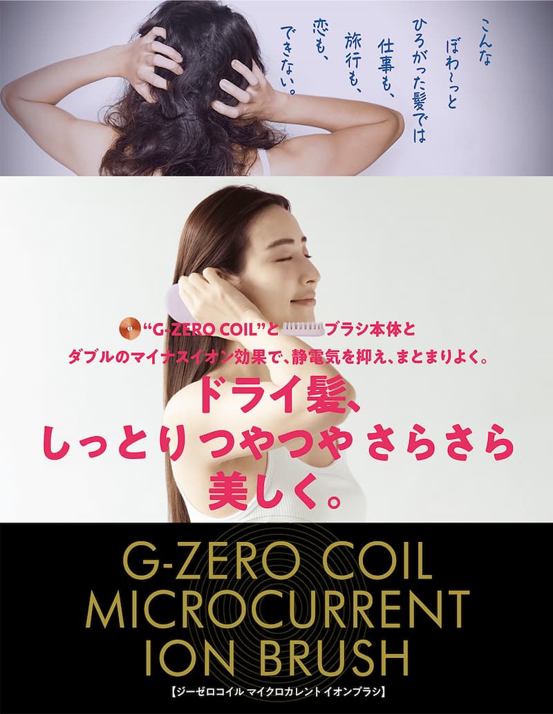 G-ZEROコイル マイクロカレントイオンブラシは、電磁波や静電気を吸収し、美容、健康、スポーツの世界でいま、注目を集める「マイクロカレント(微弱電流)」を自然発生する“G-ZERO COIL(直径8mmタイプ×10)”を搭載した、乾いた髪専用のマイクロカレント・イオンブラシです。“G-ZERO COIL”はマイクロカレントを自発するだけでなく、マイクロカレントと空気が触れることでマイナスイオンをも生成します。さらに本体シリコンにマイナスイオン鉱石を含有させ、マイナスイオン効果を増強しました。乾いた髪を静電気や摩擦から守り、絡みも抑え、さらにキューティクルの補修までも。広がりがちなその髪も、乱れがちなその髪も、“G-ZERO COIL”とブラシ本体のダブルのマイナスイオン効果で、しっとりまとまる「うるツヤ髪」へととのえていきます。![]()