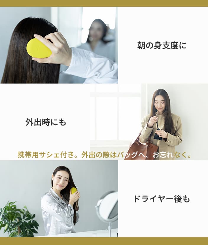 ■ 使用方法乾いた髪へ、普段使いとしてご使用ください。ゴム製品ですので、無理に引っ張らず、やさしく撫でるようにご使用ください。