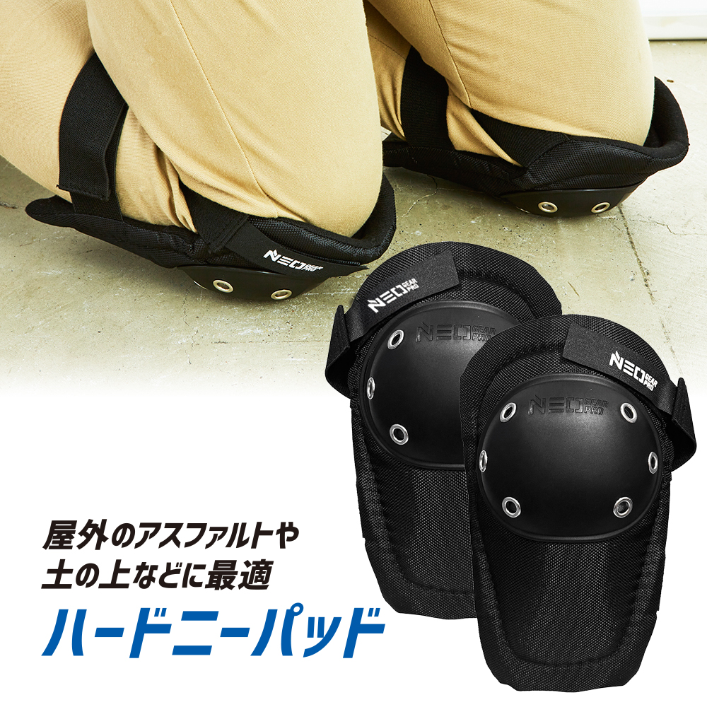 ハードカップを採用したニーパッドです。屋外のアスファルトや土の上などに最適です。面ファスナーは他繊維にくっつきにくい仕様です。2本ベルトで上下で固定します。 カラー:ブラック サイズ:フリー 素材:接地部/ハードカップ、パッド/EVA 用途・使用例:水産業、農業、畜産業、清掃業、現場作業、整備業、品だし、ガーデニング、お掃除、バイク、ウインタースポーツ等