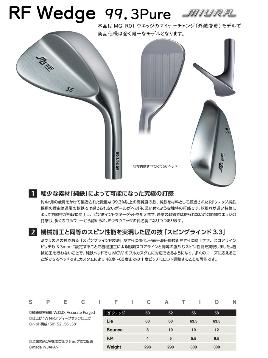 ご注意:組み立て場所(当店or三浦技研の場合別途料金)三浦技研で組み立ての場合は三浦技研の計測方法において組み立てされます。当店との計測方法等相違があります。 三浦技研 RFウェッジ ■稀少な素材「純鉄」によって可能になった究極の打感 約4ヶ月の歳月をかけて製造された貴重な99.3%以上の高純度の鉄、純鉄を材料として鍛造されたRFウェッジ。 純鉄採用の理由は通常の軟鉄では感じられないボールがヘッドに吸い付くような独特な打感です。 球離れが遅い特性によって方向性が格段に向上し、ピンポイントでターゲットを狙えます。 通常の軟鉄では得られないこの純鉄ウエッジの打感は、多くのゴルファーから認められ、ミウラウエッジの代名詞になりつつあります。 ■機械加工と同等のスピン性能を実現した匠の技「スピングラインド3.3」 ミウラの匠の技である「スピングラインド製法」がさらに進化。平面平滑研磨技術をさらに向上させ、 スコアラインピッチも3.3mmに設定することで機械加工による彫刻スコアラインと同等の強烈なスピン性能を実現しました。 機械加工を行わないことで、純鉄ヘッドでもMCWのフルカスタムに対応できるようになり、多くのニーズに応えることができるヘッドです。 カスタムにより、48度から60度までの1度ピッチにロフト調整することも可能です。 ■セミラージアイアンヘッドとの親和性が高いヘッド形状 純鉄でレギュラーサイズのウエッジを、というご要望が多く寄せられました。フルキャビティやポケットキャビティ、中空構造など、 大型化するアイアンヘッドに対応した純鉄ウェッジがRFウェッジです。シンプルなヘッド形状、誰もが使いやすいラウンドソール、 ---------------------------------------------- 純鉄精密鍛造 W.D.D. Accurate Forged 仕上げ:W Ni-Cr ディープサテン仕上げ ヘッド構成:50°、52°、56°、58° 発売予定日:2024年2月16日 made in JAPAN