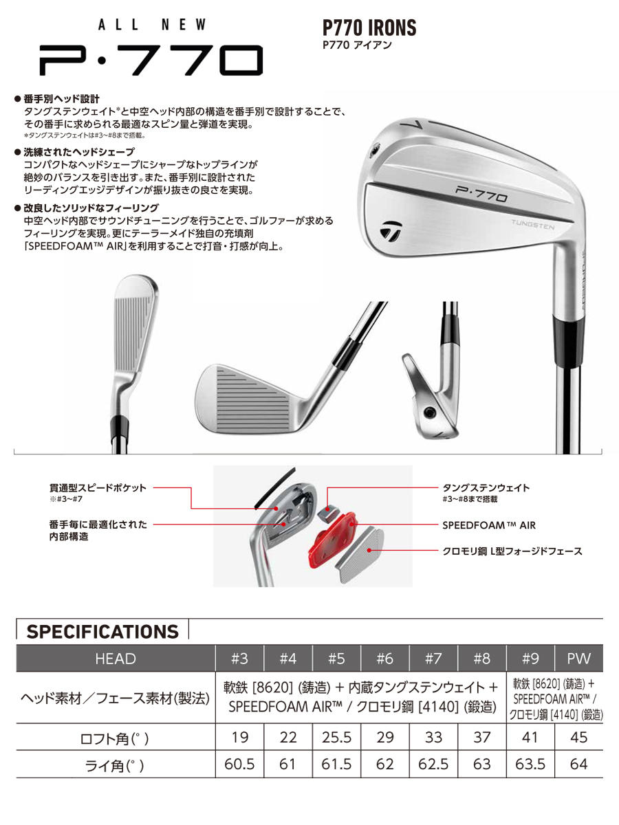 前作を凌駕するほどの心地良い打感と打音を実現。新しくなった『P770』アイアンは、軟鉄中空構造のボディに、インパクト時のクラブの振動を細かく分析し改良を加えたことで、P770史上最高クラスのフィーリングを実現。