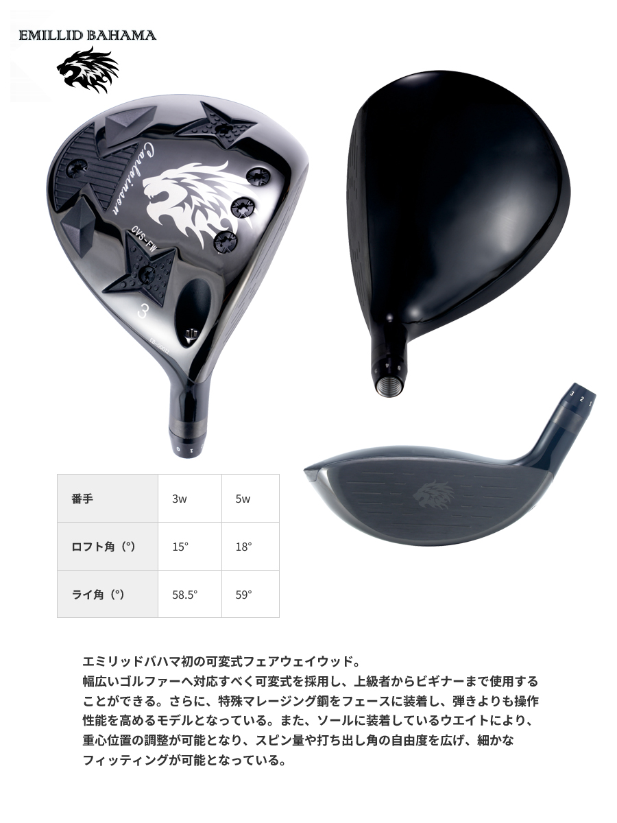2025年モデル エミリッドバハマ初の可変式フェアウェイウッド。 幅広いゴルファーへ対応すべく可変式を採用し、上級者からビギナーまで使用することができる。さらに、特殊マレージング鋼をフェースに装着し、弾きよりも操作性能を高めるモデルとなっている。また、ソールに装着しているウエイトにより、重心位置の調整が可能となり、スピン量や打ち出し角の自由度を広げ、細かなフィッティングが可能となっている。 ロフト角:15° 18° ライ角:58.5°(3W) 59°(5W)