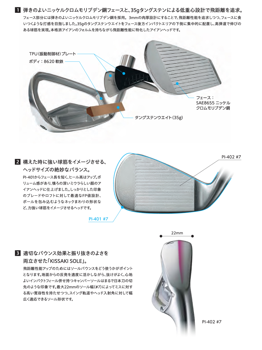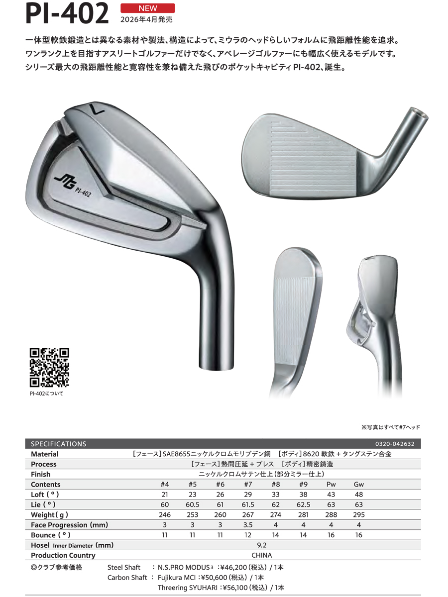 一体型軟鉄鍛造とは異なる素材や製法、構造によって、飛距離性能を追求。 ミウラらしいフォルムを纏い、飛びのポケットキャビティPI-402、誕生。 Material [フェース]SAE8655ニッケルクロムモリブデン鋼 [ボディ]8620軟鉄+タングステン合金 Process [フェース]熱間圧延+プレス [ボディ]精密鋳造 Finish ニッケルクロムサテン仕上(部分ミラー仕上) Production Year 2026