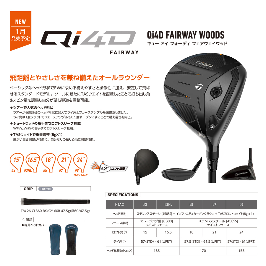 フェース下部のミスヒットに対し、ボール初速を維持し過度なバックスピンを抑える「貫通型スピードポケット」や、ミスヒット時のショットのバラつきを抑え飛距離のロスを防ぐ「ツイストフェース™」、さらに余剰重量を生み出しパフォーマンスを最大化させる「マルチマテリアル構造」など、長年ツアーで証明されているテーラーメイド独自のテクノロジーを「Qi4D」フェアウェイウッドでも搭載。