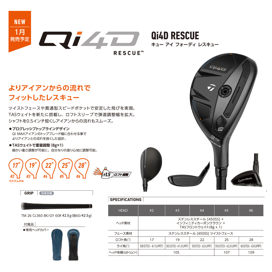 フェース下部のミスヒットに対し、ボール初速を維持し過度なバックスピンを抑える「貫通型スピードポケット」や、ミスヒット時のショットのバラつきを抑え飛距離のロスを防ぐ「ツイストフェース™」など、長年ツアーで証明されているテーラーメイド独自のテクノロジーを「Qi4D」レスキューにも搭載。