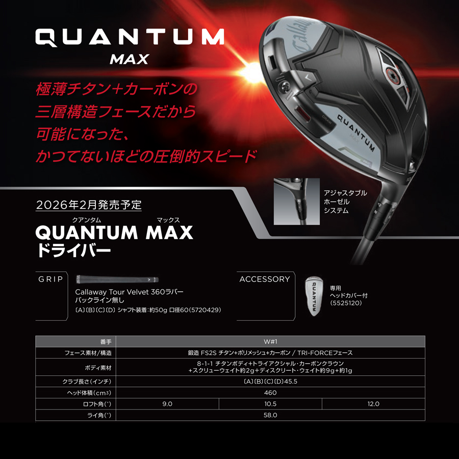 2つのバイアスを選択できるディスクリート・ウェイトシリーズにおいてスタンダードモデルの立ち位置となるのが、「QUANTUM MAXドライバー」です。ヘッドは体積が460㎤でキャロウェイらしい丸いフォルムをしており、前作のELYTEドライバーから形状を引き継いでいます。カーボンクラウンに対し、ソールにはチタンを使用していますが、これは低・深重心にして、やさしくボールが上がるようにするための設計です。ロフトは9、10.5、12度(カスタムのみ)の3種類。アジャスタブルホーゼルも採用。ソール後方には、ディスクリート・ウェイトが搭載され、内部の約9gのウェイトと約1gのウェイトの位置を入れ替えることで、ドローバイアス(ヒール約9g/トウ約1g)とニュートラルバイアス(ヒール約1g/トウ約9g)を選択することができます。なお、ソール前方のウェイトは、約2gとなっています。![]()