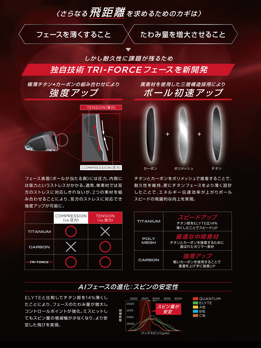 5万9000以上の試作と227万回を超えるシミュレーション新たに導入された「TRI-FORCEフェース」は、名前のトライという言葉どおり、3層構造となっています。5万9000を超えるフェースデザインと227万回以上に及ぶインパクトシミュレーションを経て完成したものです。ボールのインパクト時に、フェースの打球面には圧力が、そしてフェース裏側には張力がかかります。そこで、ボールを打つ打球面は、従来と同じく圧力に強いチタンを採用し、前作のELYTEシリーズのものより14%も薄肉化。このチタンと張力に強いカーボンファイバーの薄い層を最適な中間素材として選ばれたポリマー素材でできたポリメッシュによって重ねられました。この3層構造により、耐久性を維持しながらチタンフェースをより薄く設計でき、エネルギー伝達効率が高まると同時に、インパクト時のフェースのたわみ量やたわむスピードを高い精度でコントロールできるようになりました。
