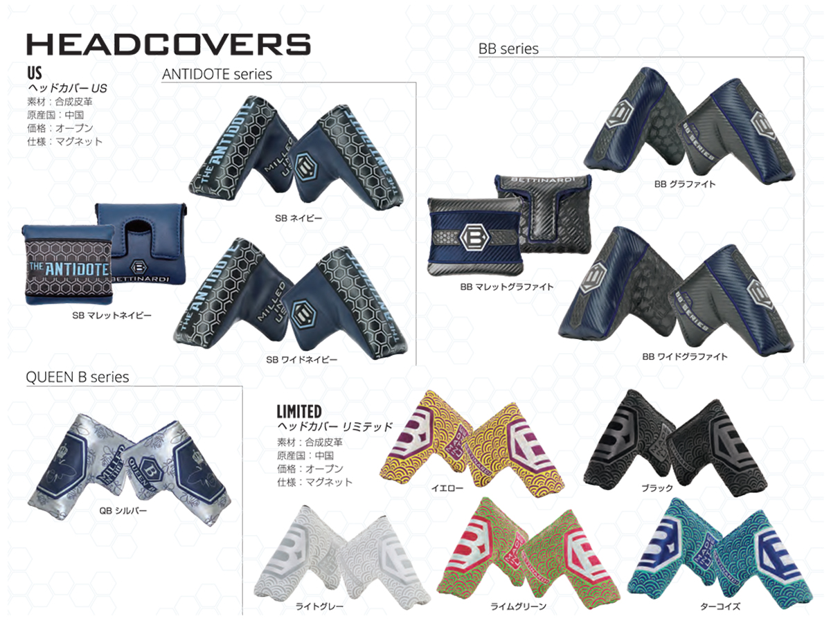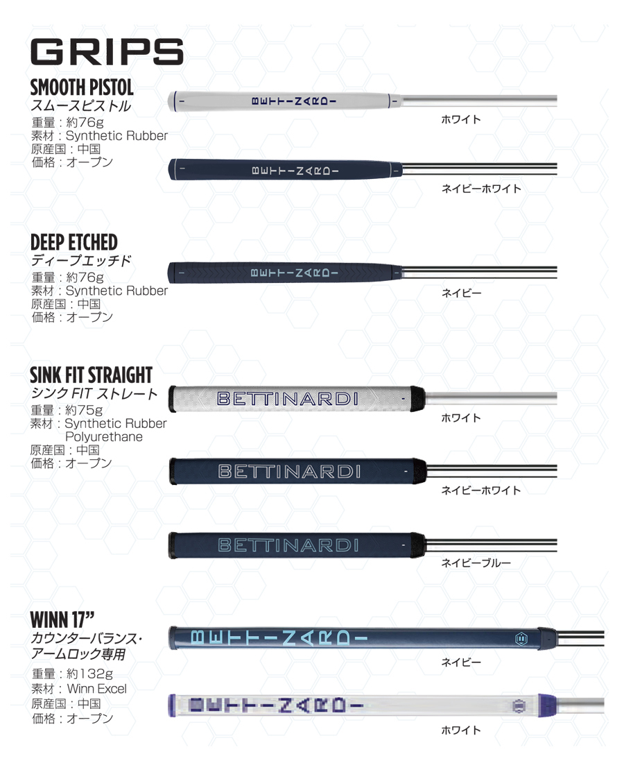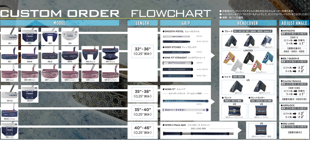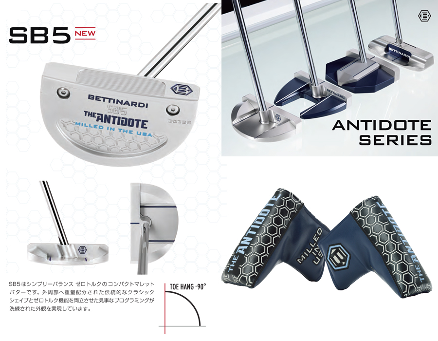 ヘッド重量360g素材/製法フェース:303SSボディ:303SSフィニッシュフェース:ダイアモンドブラストボディ:ダイアモンドブラストフェースミリングF.I.T. フェース(FEEL IMPACT TECHNOLOGY)レングス34″(カスタム32″~36″)ロフト/ライ角3°/70°グリップディープエッチドネイビー(標準)SINK FIT ストレートネイビーブルー(カスタム)ヘッドカバーSBワイドネイビーレフトハンドなしトゥハング角約-90度原産国アメリカ合衆国