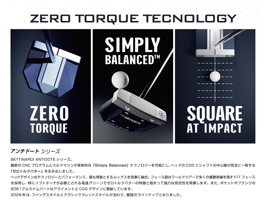 ■SIMPLY BALANCED テクノロジー・最新のプログラミングにより完全にヘッドセンターに設計された COG のヘッドを CNC ミルドマシンで完璧に再現・ストローク時、“トルクが発生しない” スクエアなフェースを実現するゼロトルクヘッド